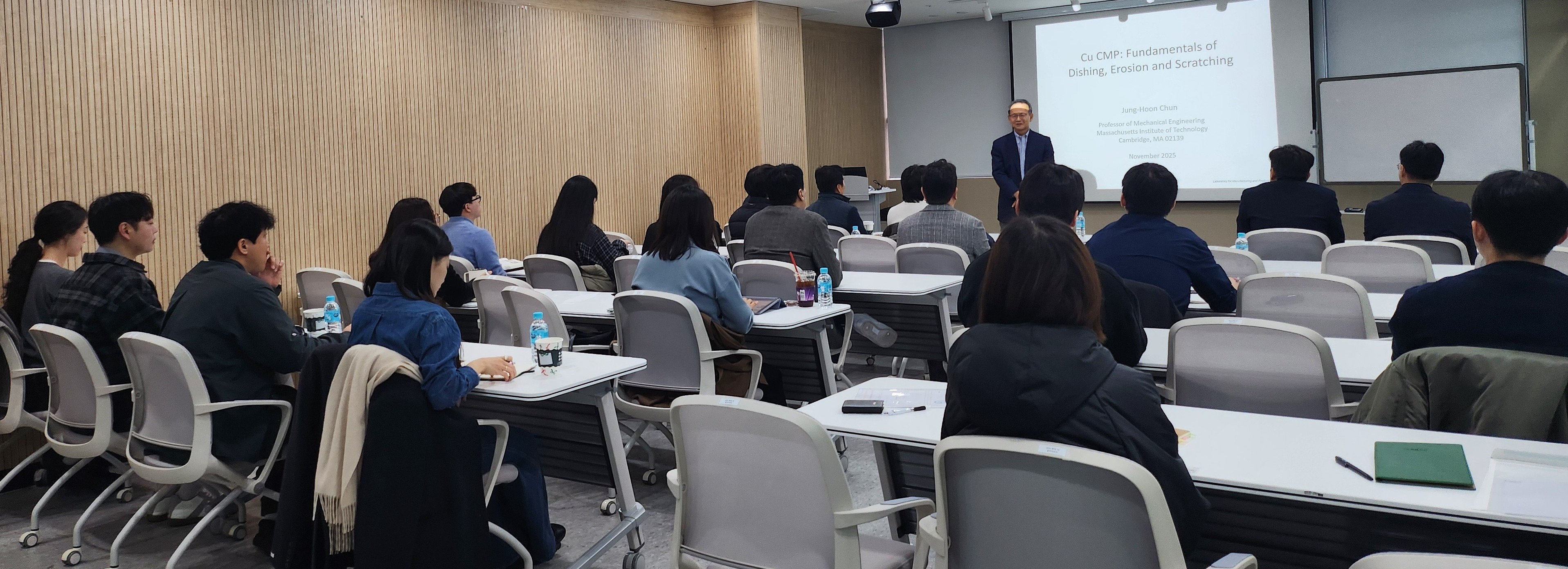 At this seminar, Professor Jung-Hoon Chun—one of the world’s leading scholars in advanced semiconductor processes and manufacturing innovation—delivered an in-depth lecture on key processes in Cu Chemical Mechanical Polishing (CMP), including dishing, erosion, and scratching, as well as the Uniform Droplet Generation Process.